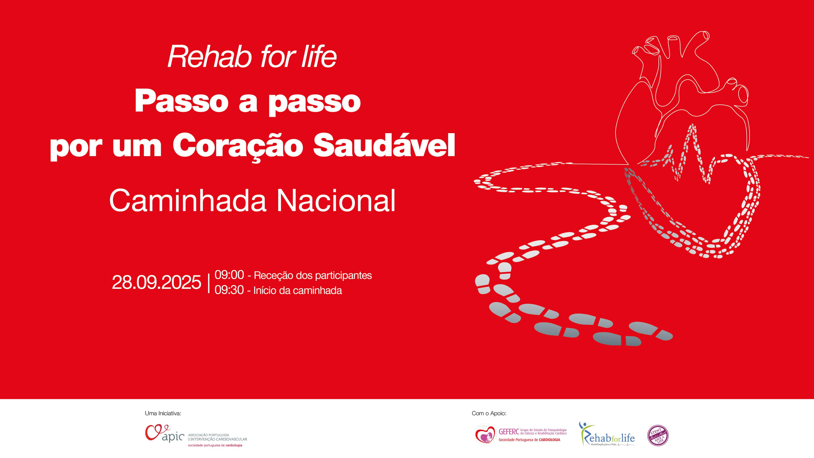A Associação Portuguesa de Intervenção Cardiovascular (APIC) volta a comemorar o Dia Mundial do Coração, que se assinala anualmente a 29 de setembro, com a 3.ª edição da caminhada nacional “Rehab for life - Passo a passo por um coração saudável”. Esta iniciativa realizar-se-á no dia 28 de setembro, em várias cidades de Portugal, tendo como objetivo consciencializar os doentes cardíacos que integrem programas de reabilitação, familiares e amigos, bem como profissionais de saúde, para a prevenção e o tratamento das doenças cardiovasculares.